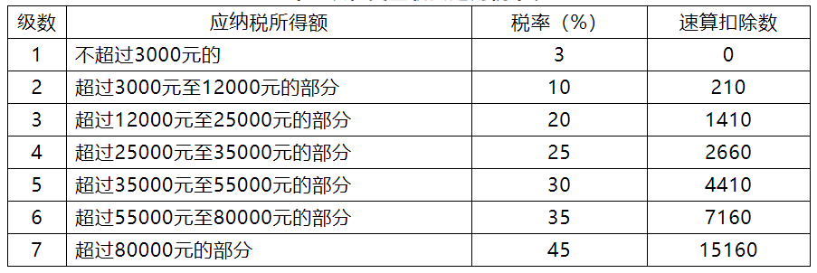 【例】小张年底取得奖金4.2万元,选择享受全年一次性奖金单独计税政策。在计算税款时,首先,用42000元除以12个月得出3500元;其次,从综合所得月度税率表中,查找3500元对应税率为10%,速算扣除数为210;最后,用该笔奖金收入乘以税率,再减去速算扣除数,得到应纳税额。即42000×10%-210=3990元,小张的全年奖应纳税3990元。