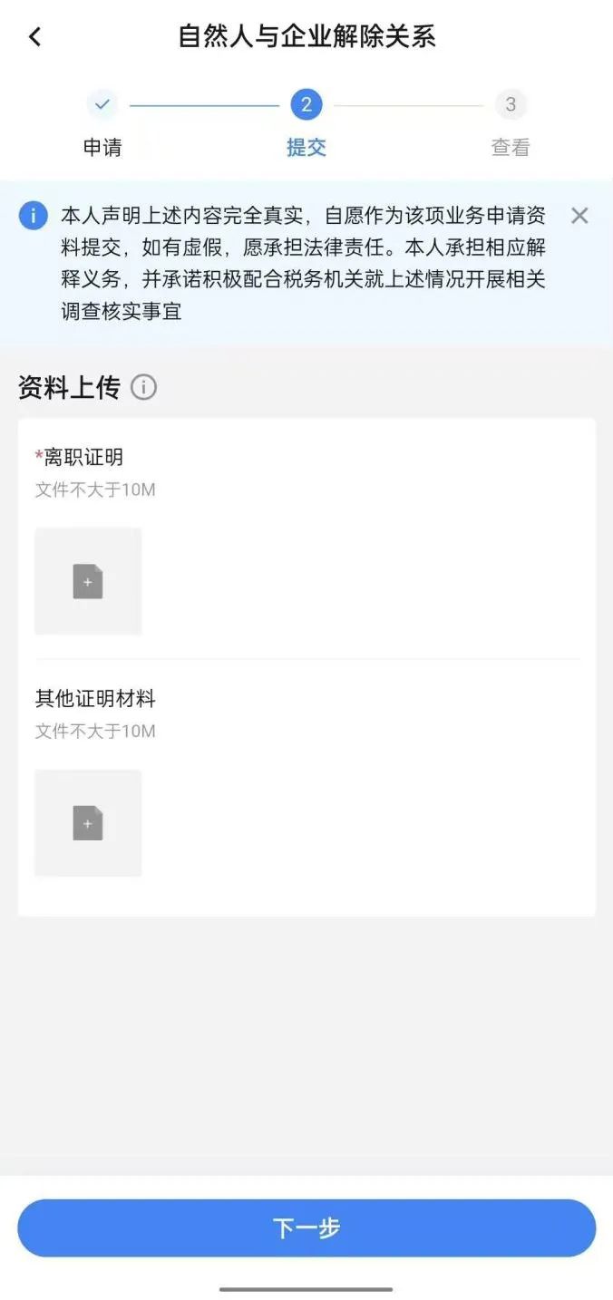 上传离职证明或其他证明材料,点击下一步,业务即可申请成功,后续会有税务工作人员帮您审核。