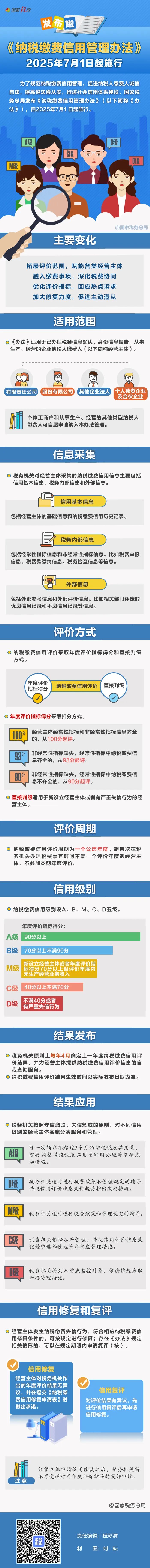 国家税务总局发布《纳税缴费信用管理办法》,自2025年7月1日起施行。