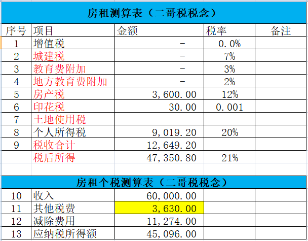 假如出租个人住房取得年租金60000,开具普通发票的话,那么实际应该缴纳的税分别是: