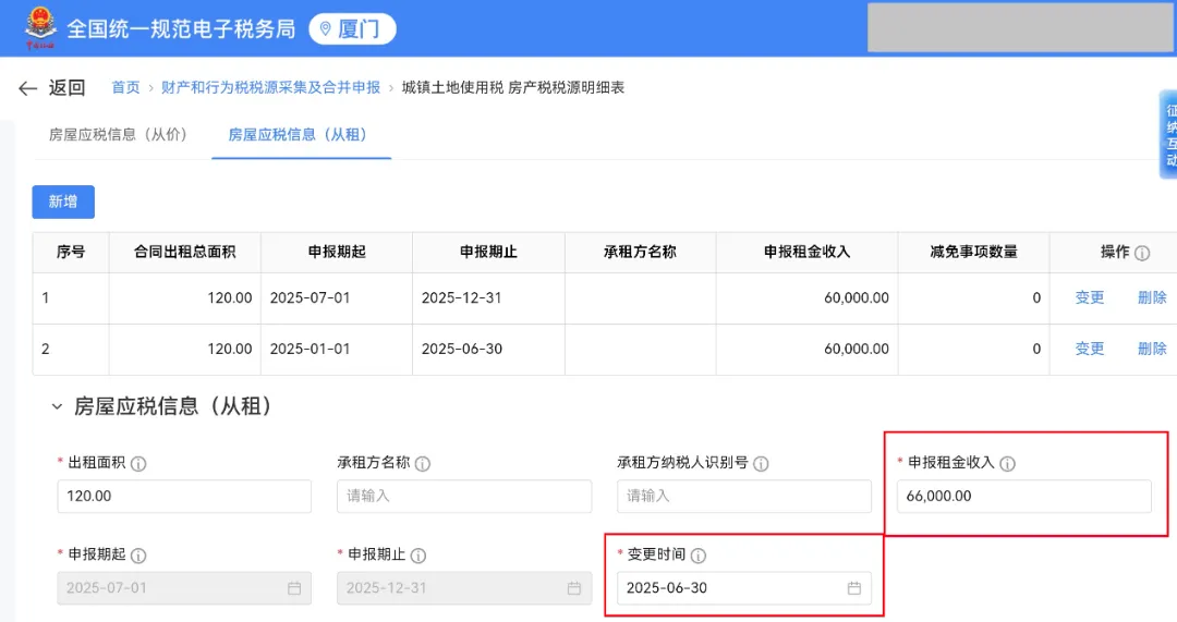 举例:一企业房产原值300万元,面积120平方米,于2024年12月30日取得。取得后将该房产出租,租期为2025年1月1日至2025年12月31日,原约定月租金10000元,年租金总额120000元。由于情况变化,2025年7月1日起,租金发生变更,企业将每月租金上涨至11000元,下半年租金总额66000元。