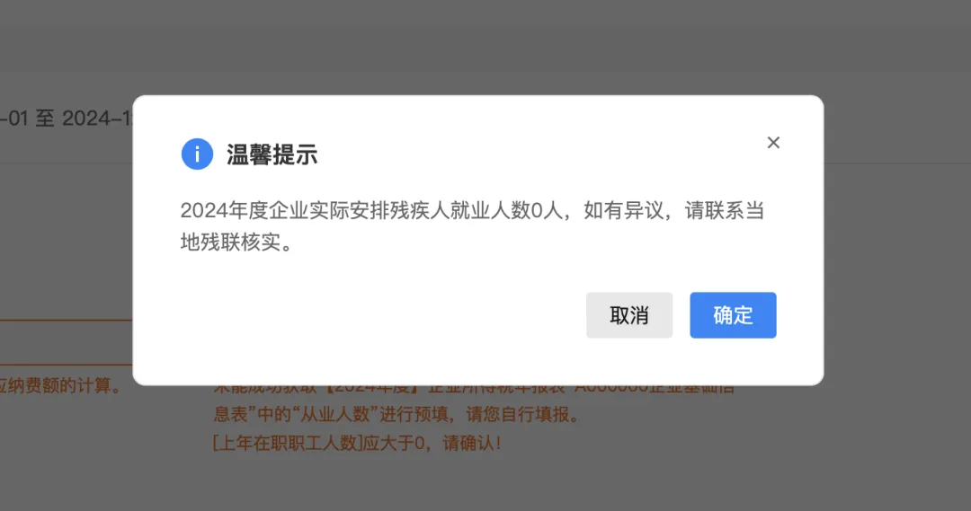 进入申报前,系统弹窗提示2024年度企业实际安排残疾人就业人数,如对人数存在异议,请联系当地残联部门进行核实。