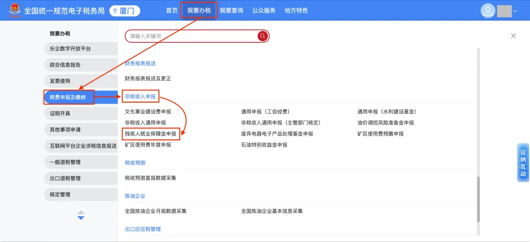 (二)首页上方搜索框输入“残疾人就业保障金申报”;