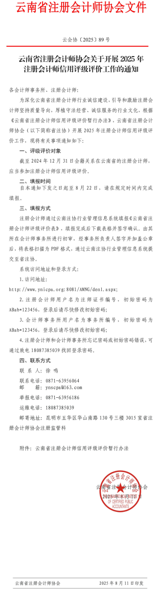 云南省注册会计师协会关于开展2025年注册会计师信用评级评价工作的通知