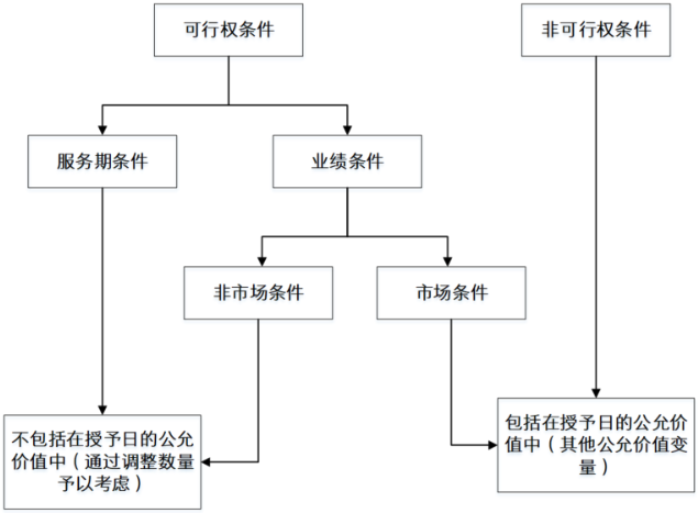 答:企业根据国家有关规定实行股权激励的,股份支付协议中确定的相关条件,不得随意变更。其中,可行权条件是指能够确定企业是否得到职工或其他方提供的服务、且该服务使职工或其他方具有获取股份支付协议规定的权益工具或现金等权利的条件;反之,为非可行权条件。可行权条件包括服务期限条件或业绩条件。服务期限条件是指职工或其他方完成规定服务期限才可行权的条件。业绩条件是指职工或其他方完成规定服务期限且企业已经达到特定业绩目标才可行权的条件,具体包括市场条件和非市场条件。