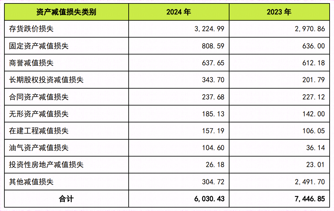 据同花顺ifind数据,截至2025年6月5日,5,415家A股上市公司中共有5,410家公布了2024年年报,5,410家已公告年报上市公司中有5,168家(95.56%)2024年度发生资产减值损失,2024年度A股上市公司资产减值损失总计达到6,030.49亿元,较2023年度的7,446.90亿元减少1,416.41亿元。