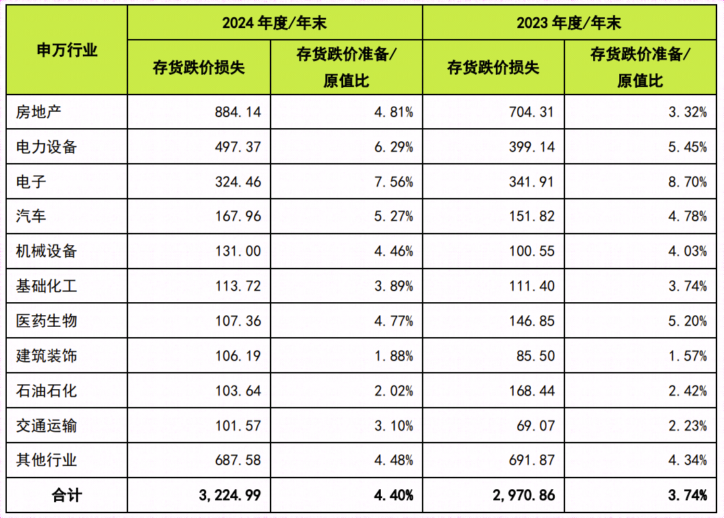 房地产行业主要受房价持续下跌、市场长期疲软、历史高地价项目结转等影响,大面积计提存货跌价损失;电力设备行业主要受产业链价格战、原材料价格波动、技术迭代加速、资产老化等影响大量计提存货跌价损失、固定资产减值损失。