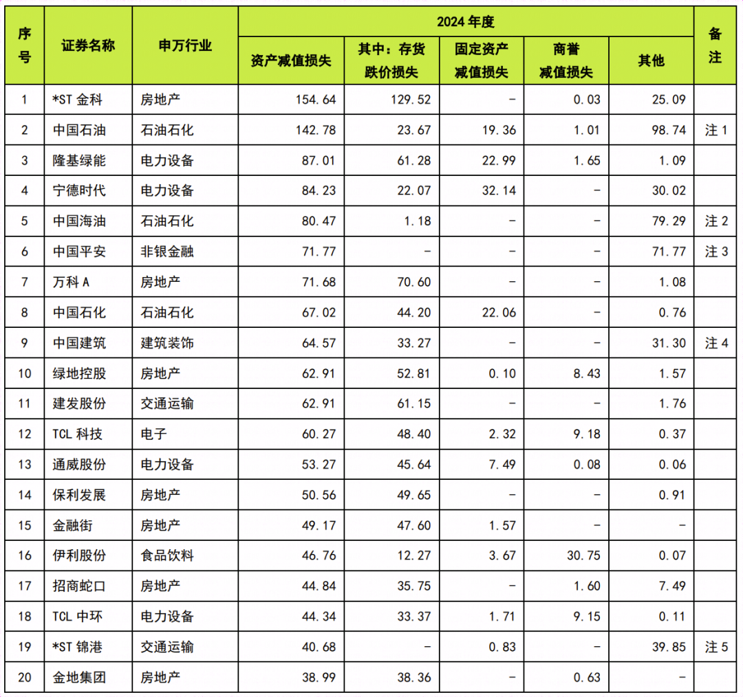 2024年度资产减值损失前二十名的上市公司中,房地产行业7家、电力设备行业4家、石油石化行业3家。