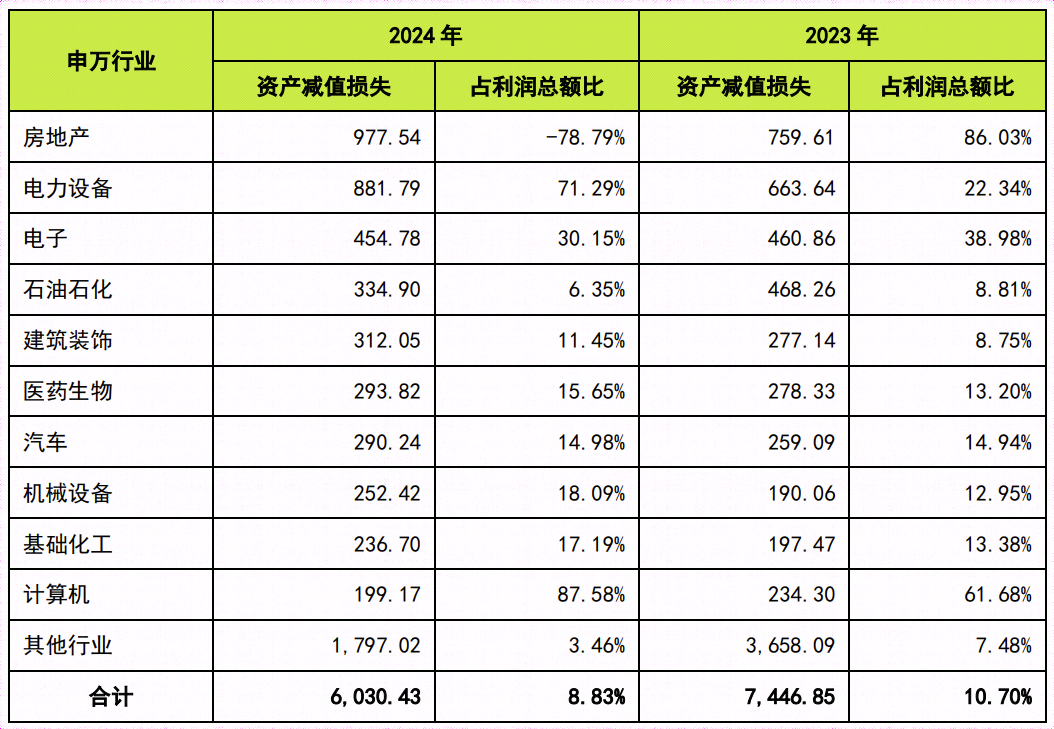 据同花顺ifind数据,截至2025年6月5日,2024年度共有5,168家上市公司发生资产减值损失,规模达6,030.49亿元。其中房地产、电力设备行业承受了超800亿元规模的减值压力,成为风险集聚区。