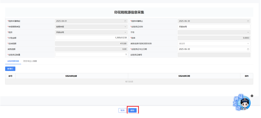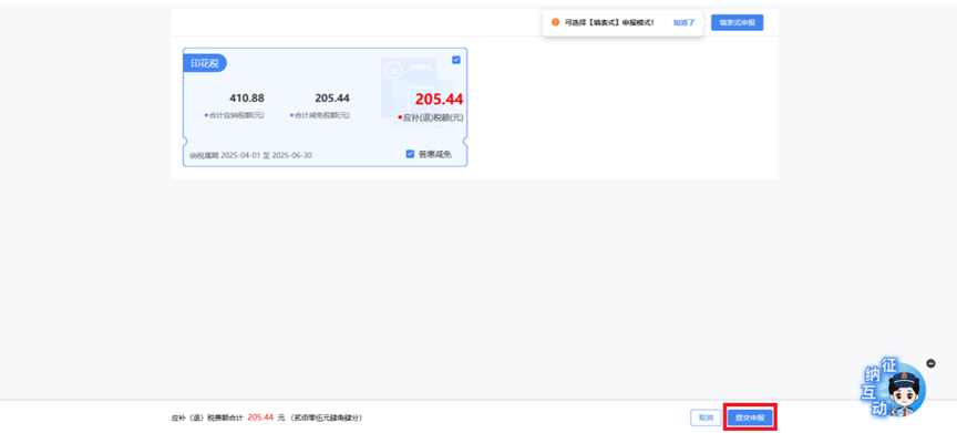 回到“印花税税源明细表”界面,仔细核对计税金额、应税凭证名称等数据,确认无误后,点击下方【提交】按钮。