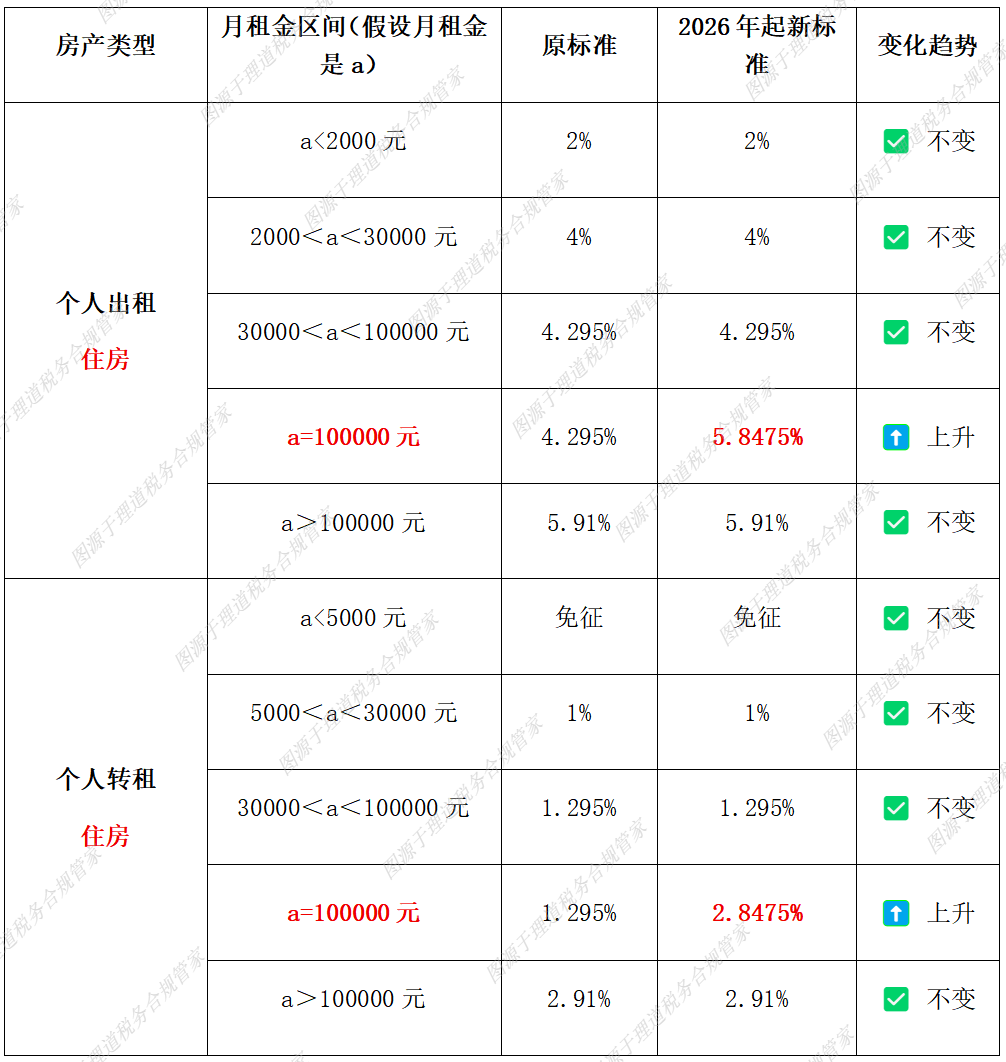 综合征收率档次增加:针对月租金10万元增加单独一档征收率,相比于原政策月租金10万元的征收率有所上升