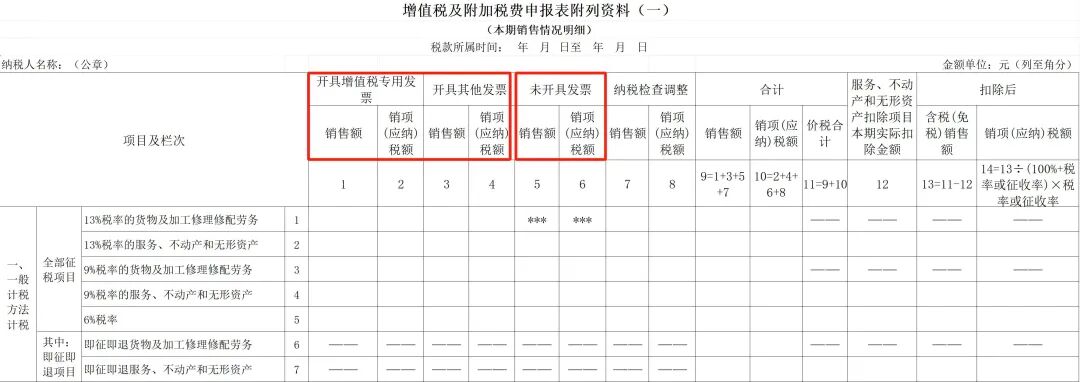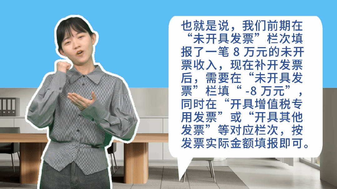 一般纳税人前期未开票收入已申报,补开发票后,在开票所属期申报增值税时,填写《增值税及附加税费申报表附列资料(一)》(本期销售情况明细)的第5、6列“未开具发票”列次,做已开票销售额的负数申报填写,其余的按所属期的销售额正常申报。