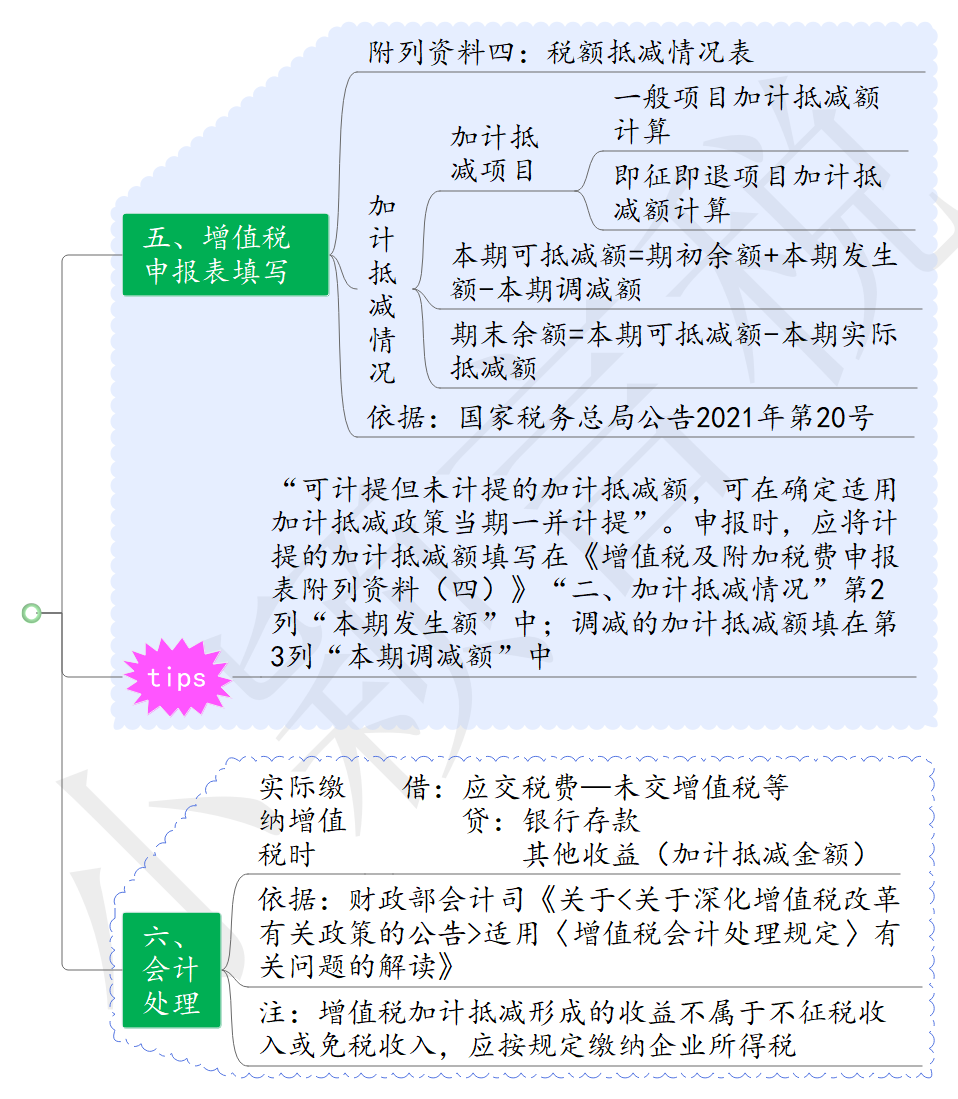 (1)计提加计抵减额=当期可抵扣进项税额×5%=100×5%=5万元;