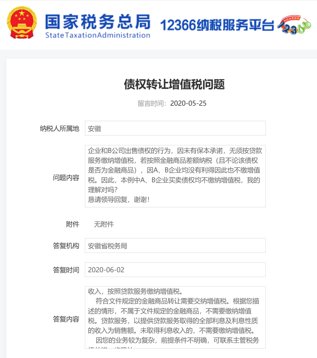 我是上次咨询债权转让税务(增值税)问题的,因我的问题未叙述清楚,特重新提请,烦请12366转省局货劳处领导,谢谢!