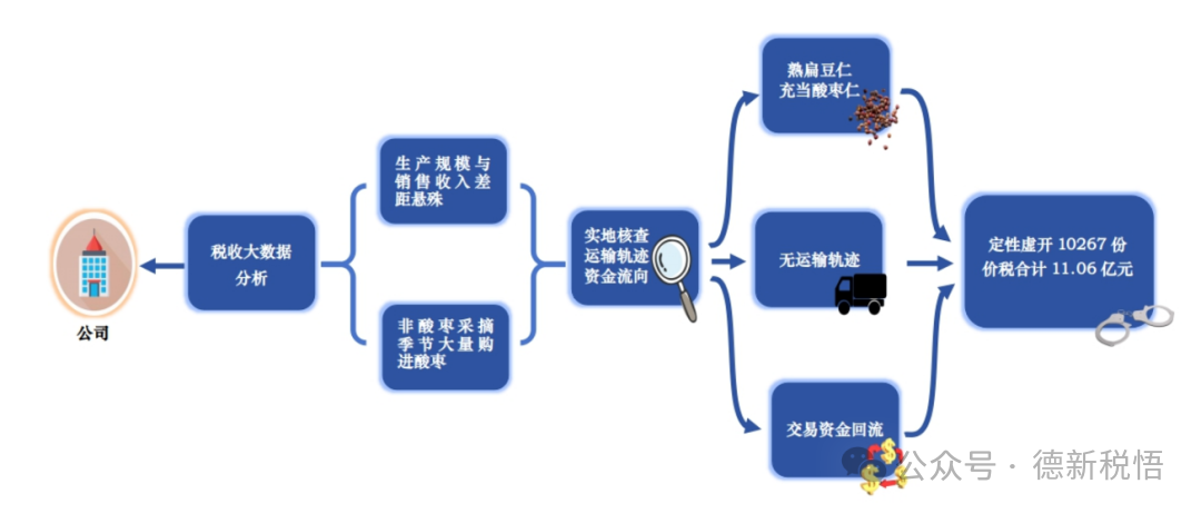 检查人员随即调取了8户企业的税费申报数据和进销项发票的开具情况,进一步了解企业的生产经营模式。经核实,8户企业均是购进酸枣去除果肉进行破壳,产出酸枣仁后对外销售。但上述8户企业只有对外销售酸枣仁时才突击采购酸枣,甚至在1-2月非酸枣采摘季节大量购进酸枣,农产品收购票清一色“顶额连号”,这明显不合理。