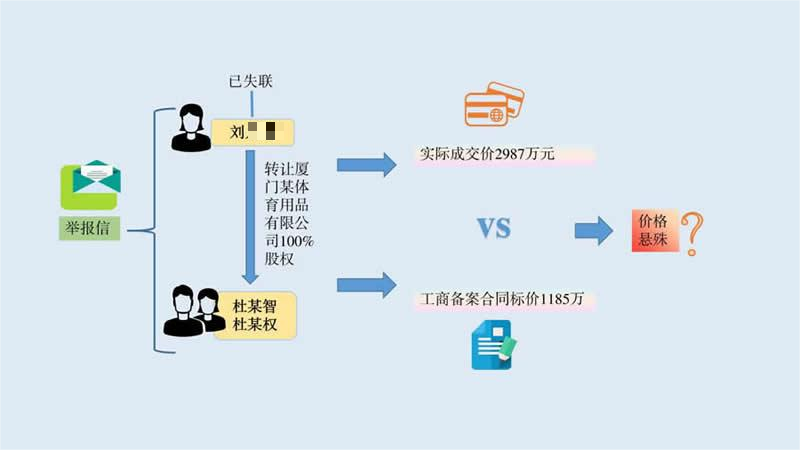 2023年,厦门市税务局第二稽查局收到一封关于举报刘某某在股权转让过程中涉嫌逃避缴纳个人所得税的举报信。举报人反映,2018年10月刘某某将厦门某体育用品有限公司100%股权以实际成交价2987万元转让给杜某智、杜某权,双方纸面签订的工商备案合同标价却仅为1185万,与实际成交价相比价格悬殊。