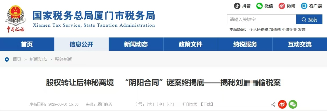近期,国家税务总局厦门市税务局第二稽查局依法查处一起利用“阴阳合同”逃避缴纳个人所得税的偷税案件。经查,刘某某通过签订“阴阳合同”、私人账户收款等手段,隐匿个人股权转让收入,偷逃个人所得税,扰乱税收秩序。2024年9月,税务稽查部门对其违法行为依法作出追缴税款,并处罚款共计652.26万元的处理处罚决定,并依法加收滞纳金。
